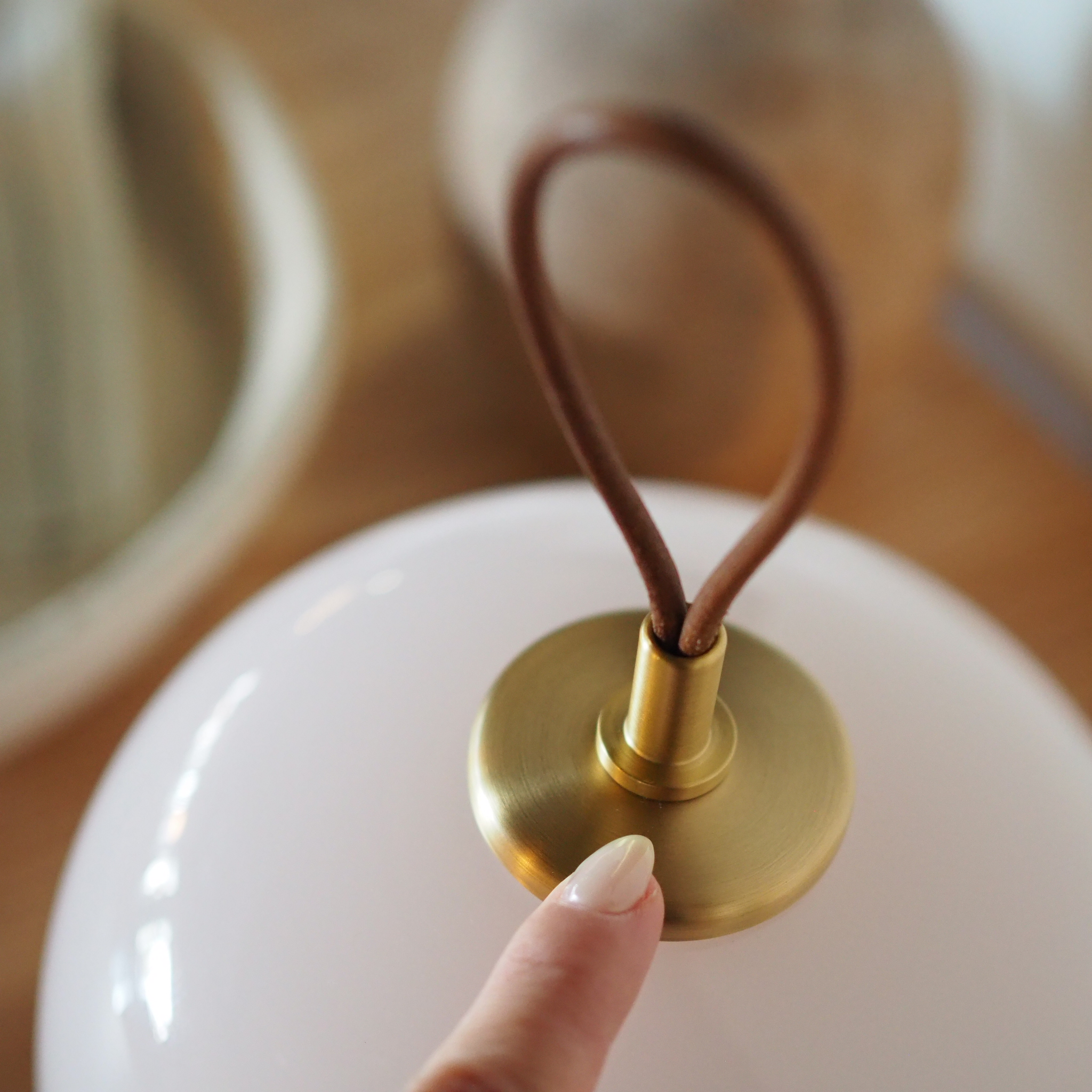 ラジオハウスならではの真鍮とガラスの美しさに合わせて、レザーの持ち手がアクセントになっていて