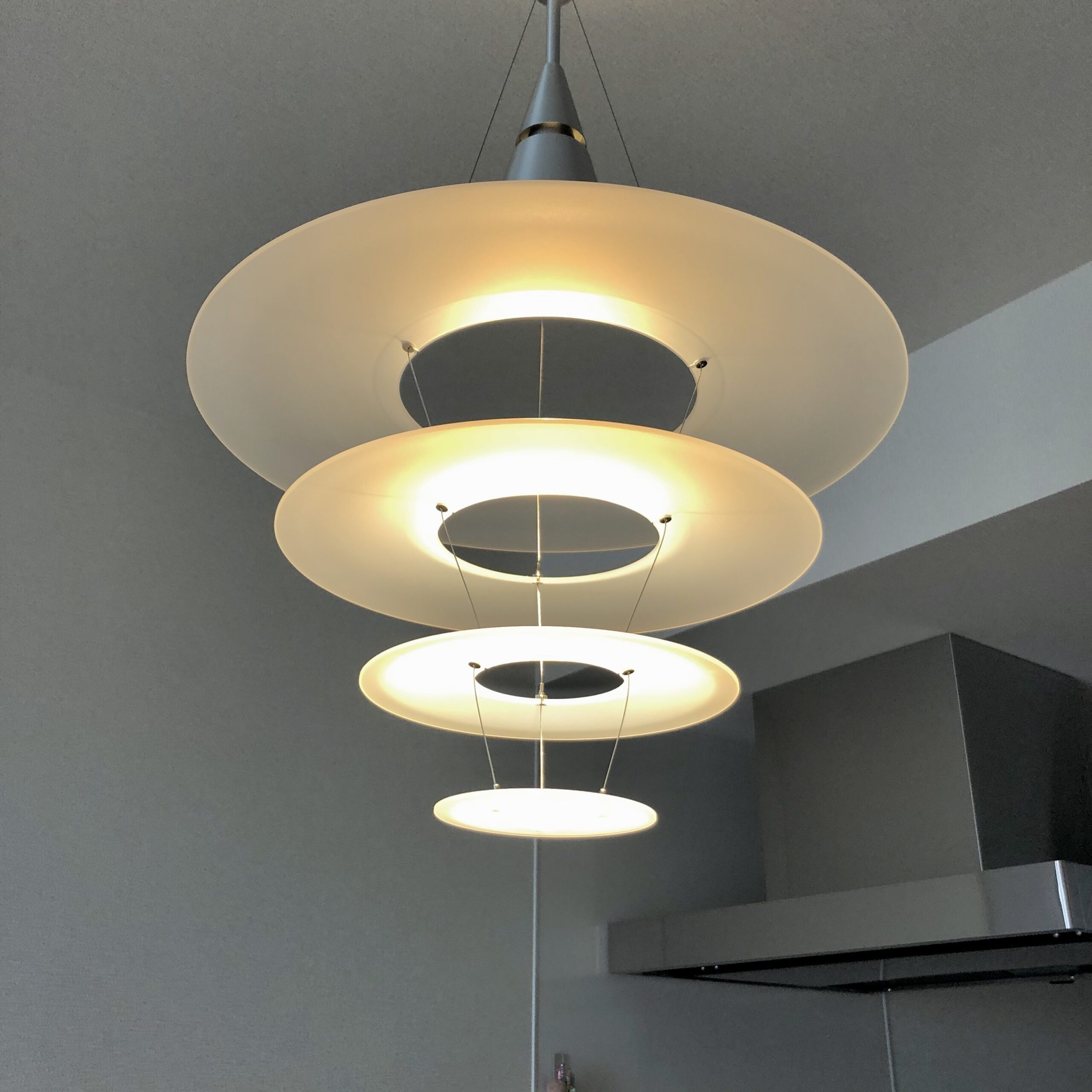 Louis poulsen社のENIGMAペンダントライトは特徴的なダイニングセットにも美しく存在感を示すアクリルシェードの照明です。
