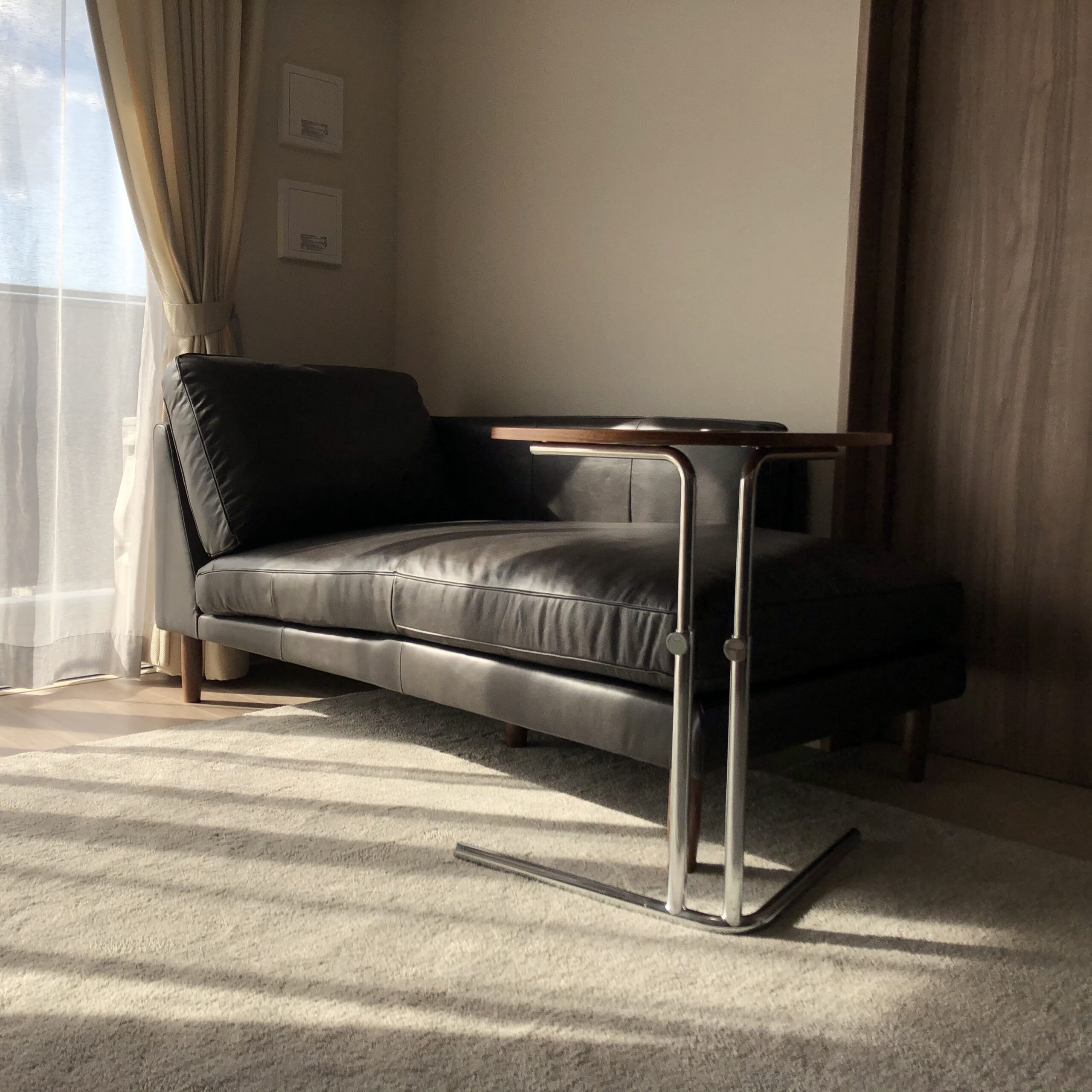 リビングシーンには、カウチソファのカウチ部分をシェーズロングソファとして使い、ダイニングテーブルと同じTECTA社のサイドテーブルを合わせて、お部屋全体のテイストの統一感を演出しています。