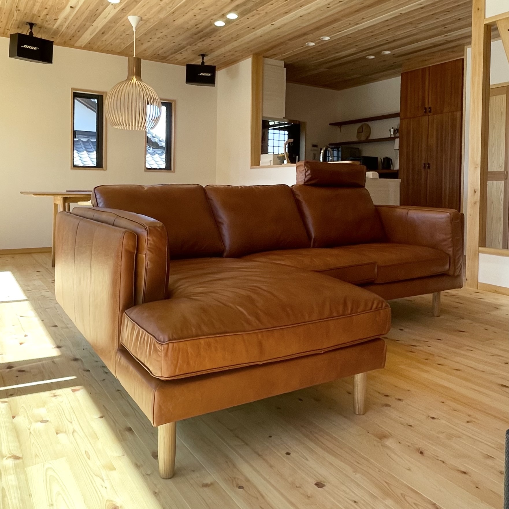 ソファは革特有のしっとりとした質感や経年変化をしっかりと楽しむことのできる、風合いのあるオイルレザーです。