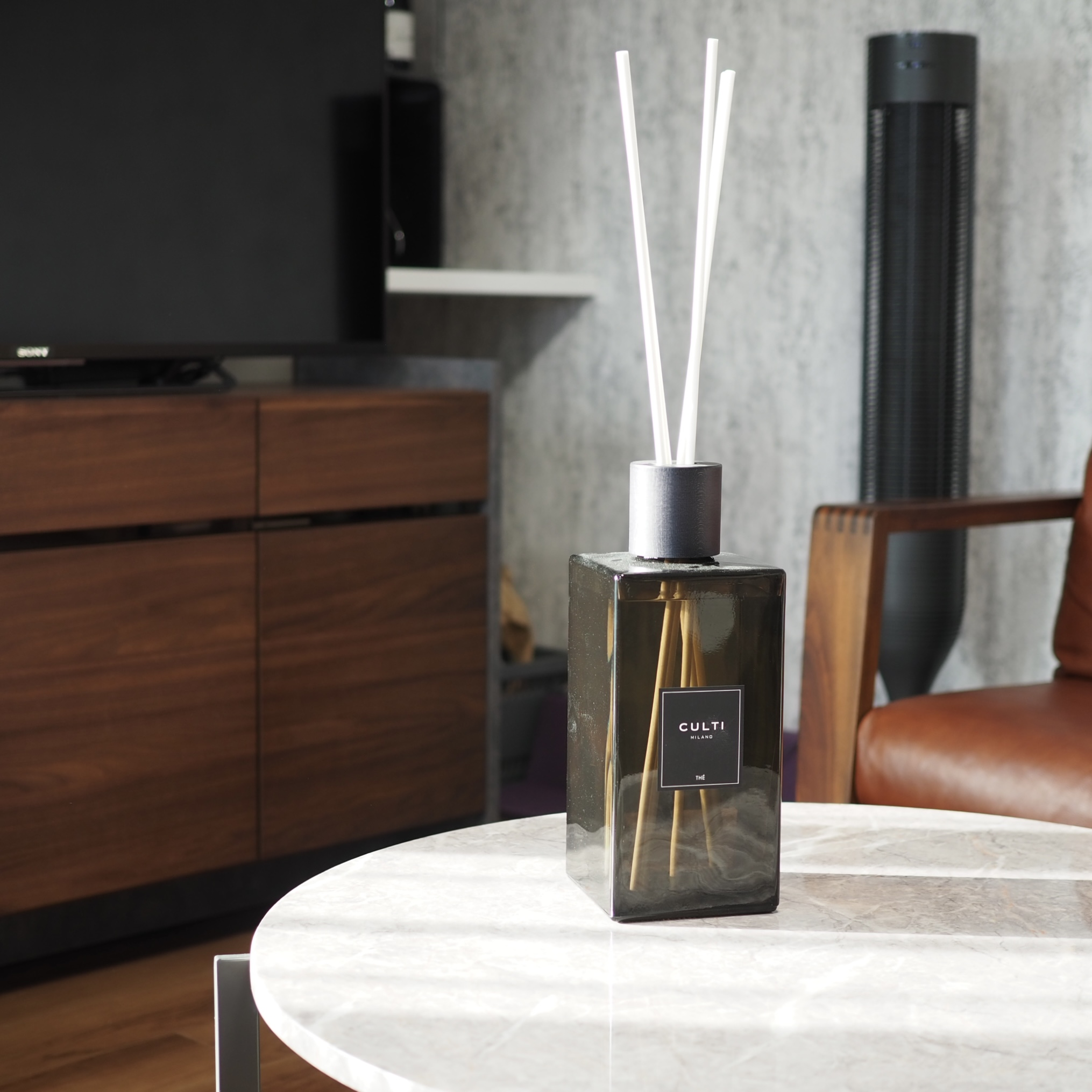 上質なお部屋にはグランデサイズのルームディフューザーをお選びいただきました。ブラックガラスのスクエアボトルは、オブジェのような存在感でインテリア性も高めてくれます。
