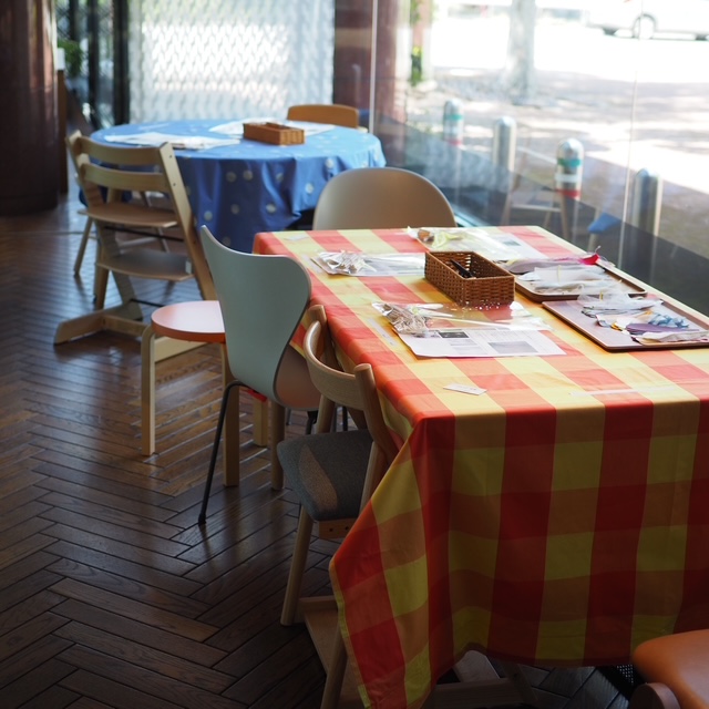 ワークショップの会場には、実際にヒンメリを飾り、北欧カラーのカラフルなテーブルクロスをかけてお出迎え。 インテリア雑貨と組み合わせて気分を盛り上げます。
