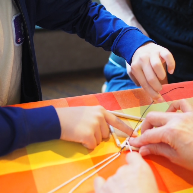 まずは糸をほどくところから。 最初は小学生でも長い糸と針(今回は針金棒)を上手に使うのは、なかなか難しかったのですが、作業が進むごとにだんだん慣れていかれるのを感じました。