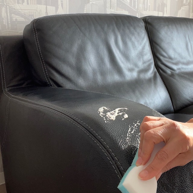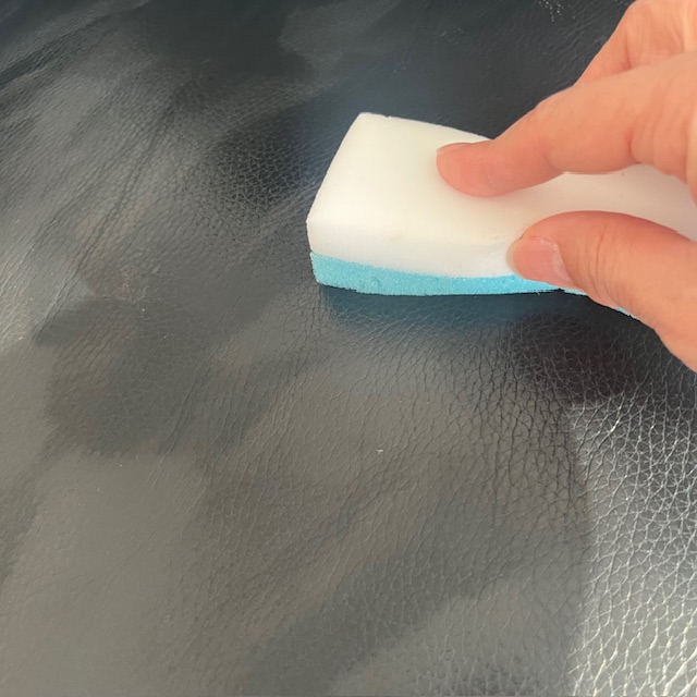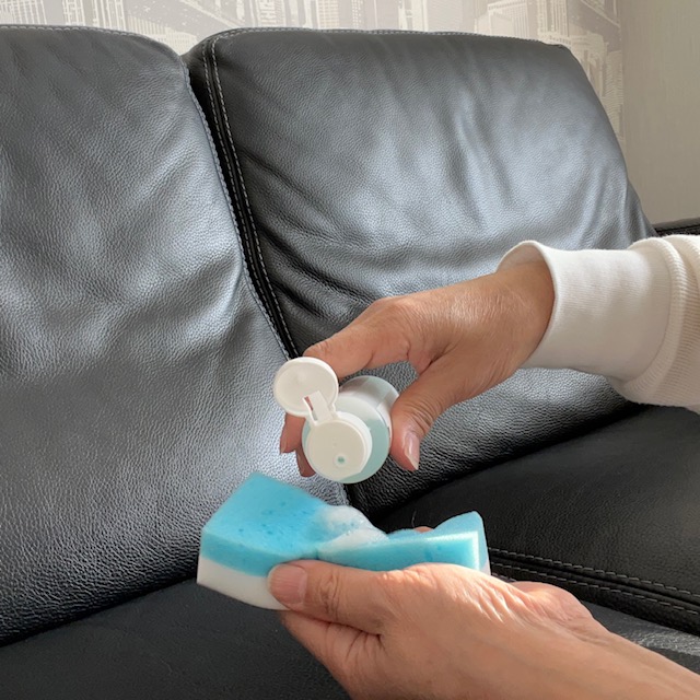 クリーナーのボトルをよく振り、スポンジ(青色の方)に少量含ませ泡立てます。通常のスポンジで取り除くことのできない頑固な汚れには、ステインイレイザースポンジ(白い方)を使用してください。*強い力で擦ると、色落ちや皮革を傷つけてしまう恐れがあります。