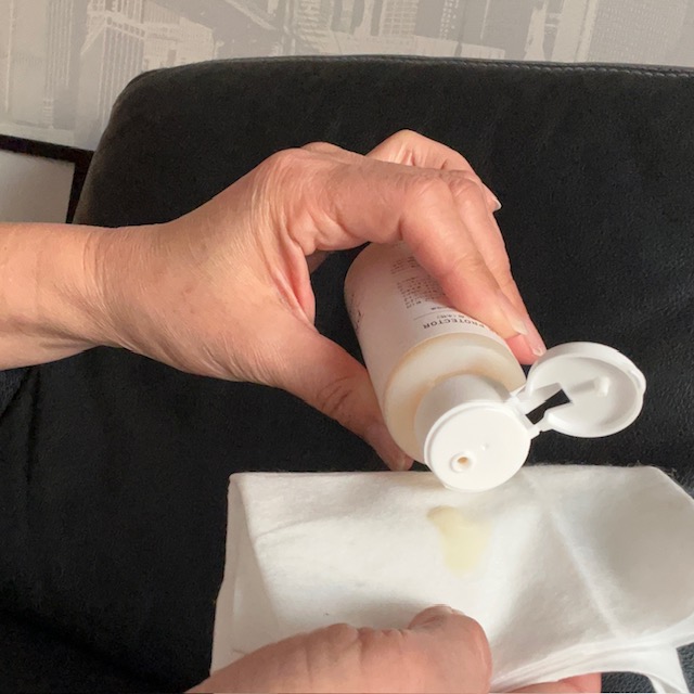 レザークリーナーで汚れを落とし乾燥させた後、布に少量含ませ馴染ませます。