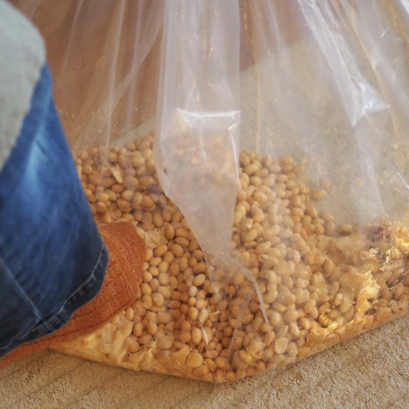大豆は手で潰すのが大変なので、毎年足でふみふみして潰しています。