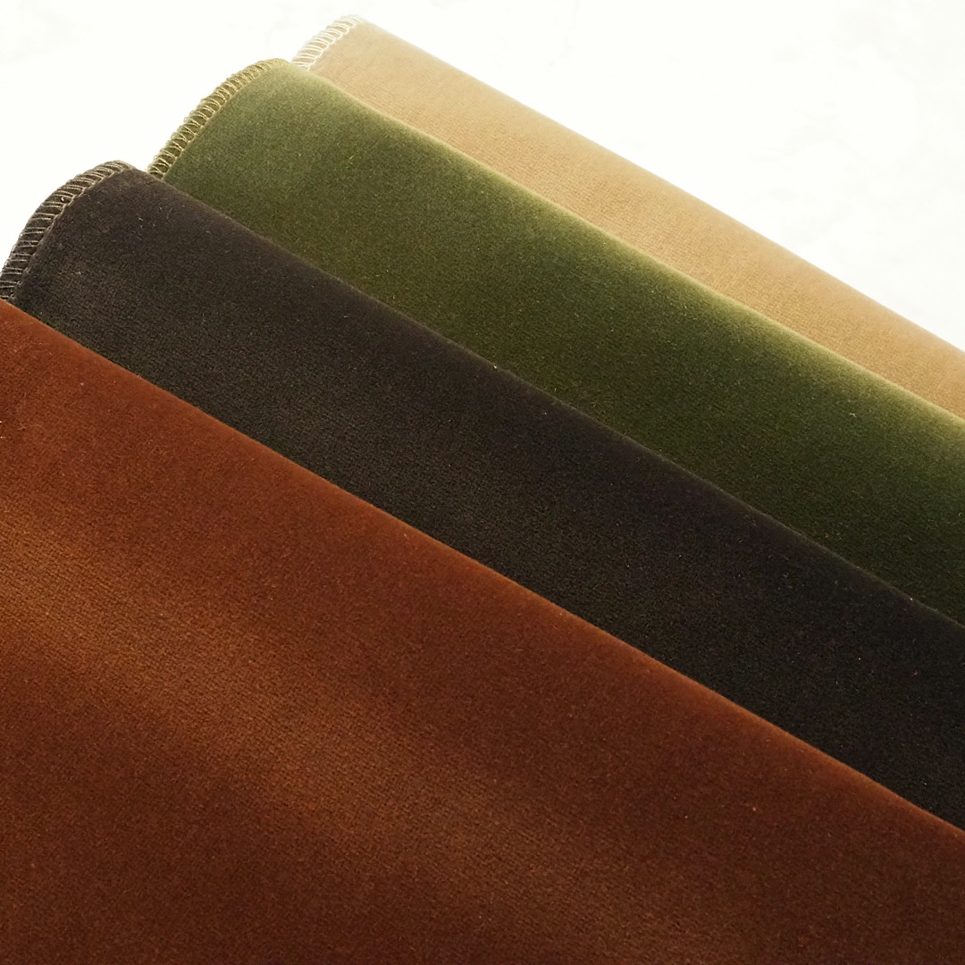 コットン主体のベルベット生地。ポリエステル主体のベルベットに比べて、光沢に品があり高級感を演出できます。