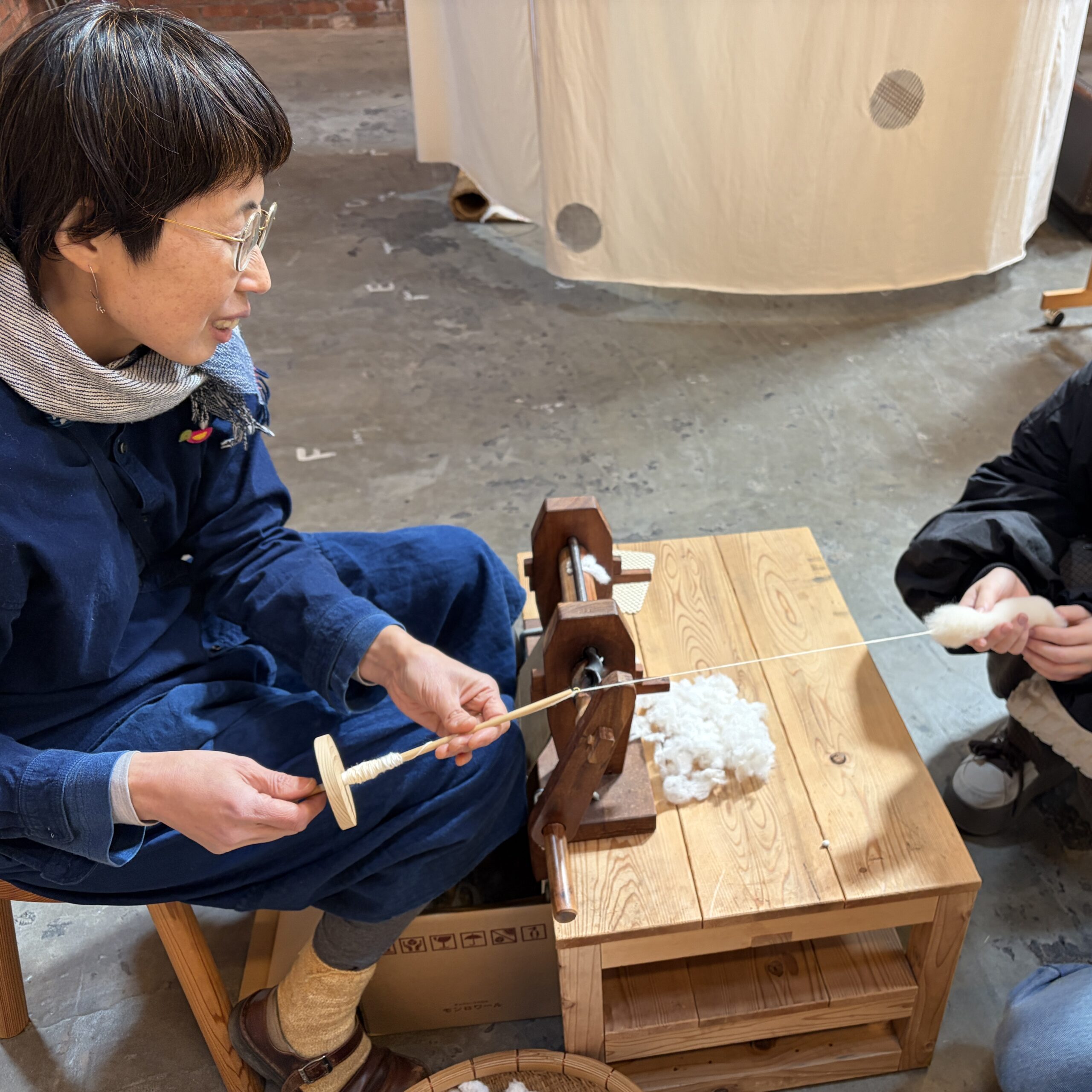会場では、栽培された綿が糸になるまでの工程を体験させていただき、すべてが手作業で行われていることに驚かされます。