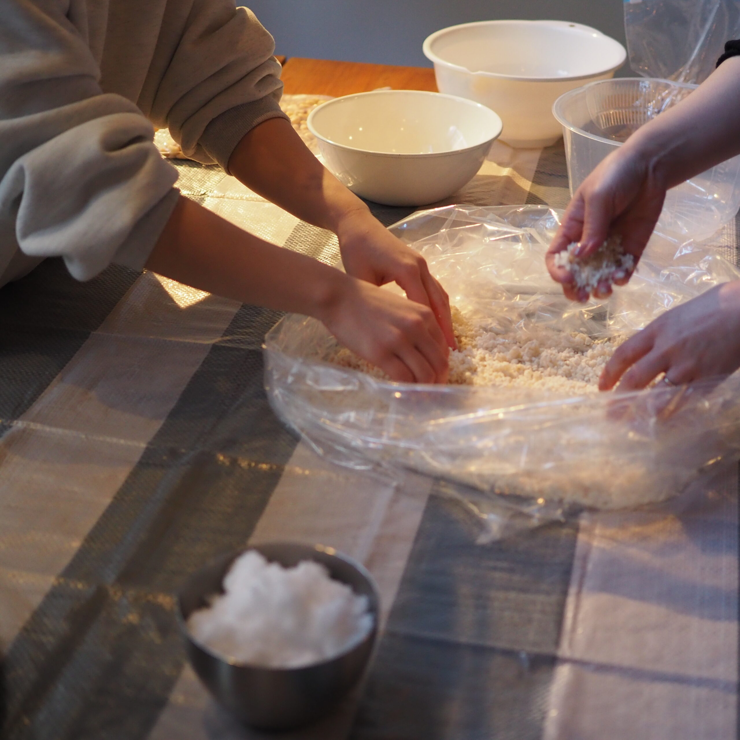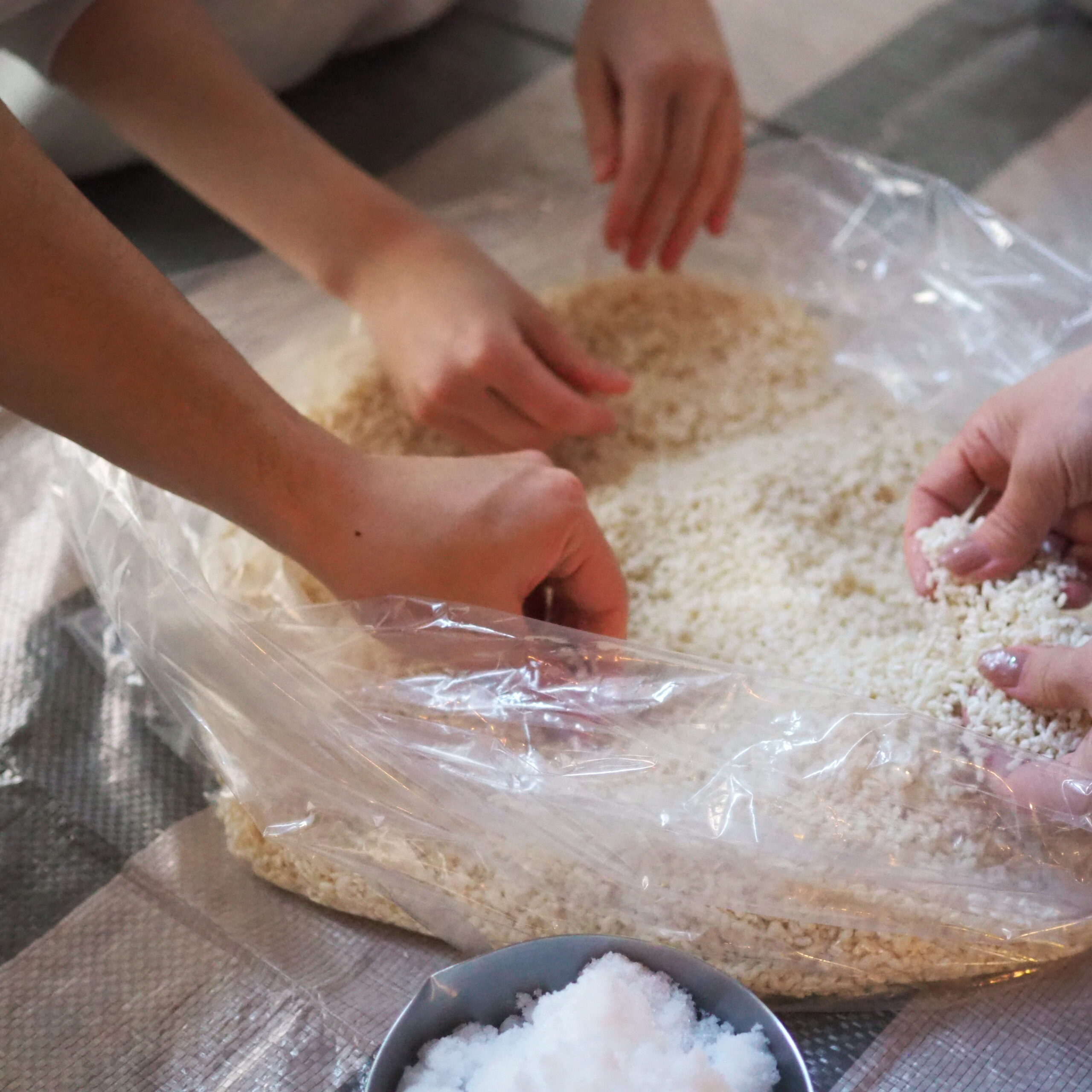 麹と塩を混ぜ合わせていく作業は、シンプルながらも手間と時間がかかるもの。
