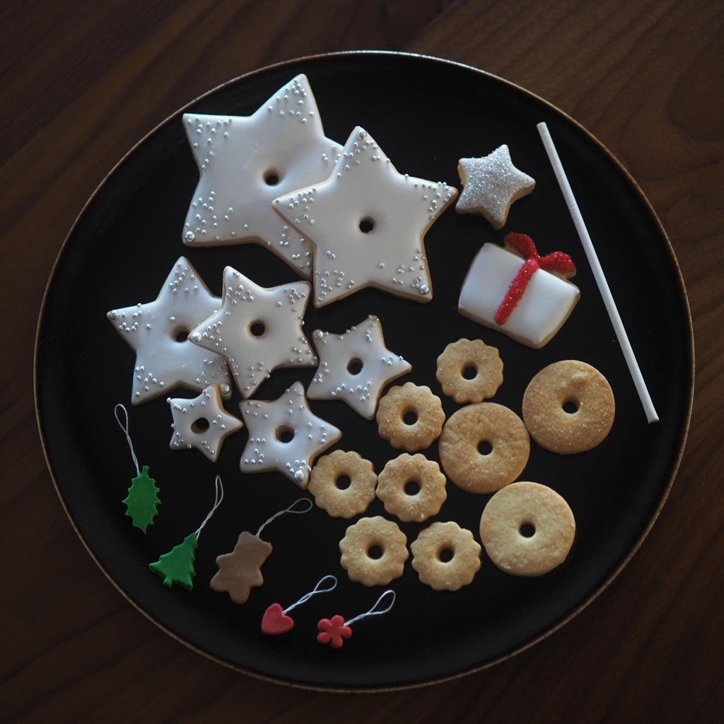 形の異なるオリジナルのアイシングクッキーをタワーのように積み上げていくと可愛いツリーが出来上がります。